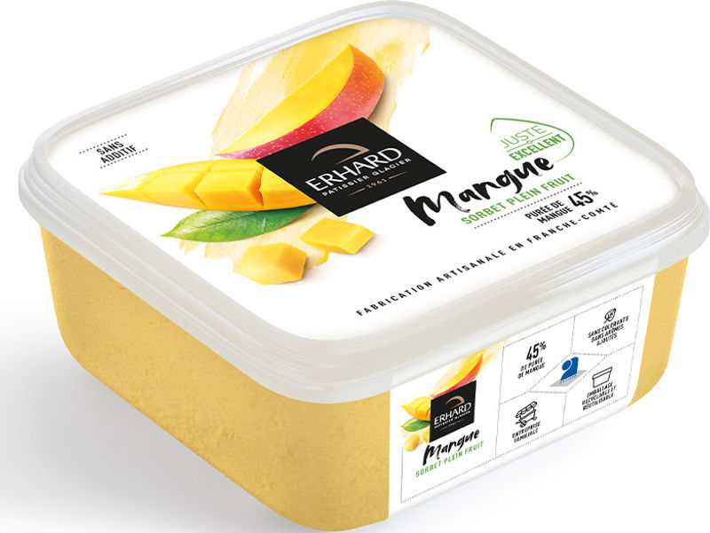 Indulge your senses with Erhard's Mango Full-Fruit Sorbet, a dessert that expertly captures the essence of juicy, tropical mangoes. This exquisite sorbet features a generous 45% mango puree, delicately sweetened with sugar and enhanced with the zesty freshness of lemon juice. As a nod to the artisanal tradition, it is enriched with flax fibers, resulting in a smooth, velvety consistency that lingers on the palate. Please be aware, it may contain traces of milk, egg, nuts, soy, chungers, and sesame.