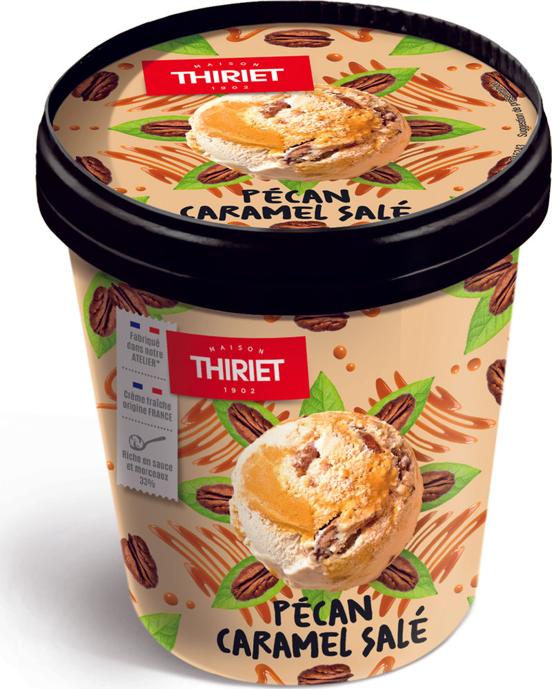 Experience the luxurious taste of French cuisine with Maison Thiriet's Salted Caramel Pecan Ice Cream. Each scoop of this frozen delight combines the creamy texture of authentic French whipping cream with the perfectly balanced blend of sweet and salty caramel, accented by the crunch of sumptuous pecan nuts. This ice cream is crafted using high-quality ingredients such as rehydrated skimmed milk powder, free-range egg yolk, and Guérande salt, a Protected Geographical Indication, promising you an authentic and indulgent French dessert experience.