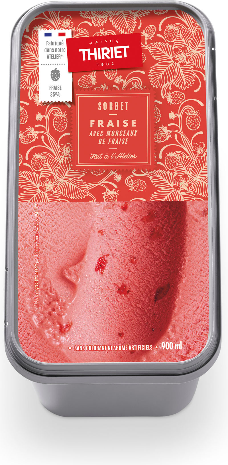 Introducing Maison Thiriet's Strawberry Sorbet With Strawberry Pieces- a delightful frozen treat that's as satisfying as it is refreshing. We've crafted this sorbet using 38% strawberries, including puree and chunky pieces, ensuring an authentic and fresh taste in every spoonful. It's then sweetened with a touch of sugar and glucose syrup, with a pop of concentrated lemon juice for that extra tang. The addition of pea protein provides a nutritional boost, while a medley of natural colors and thickeners help maintain its appealing look and texture. Please note, this product may contain traces of egg, gluten, milk, soya, and nuts.