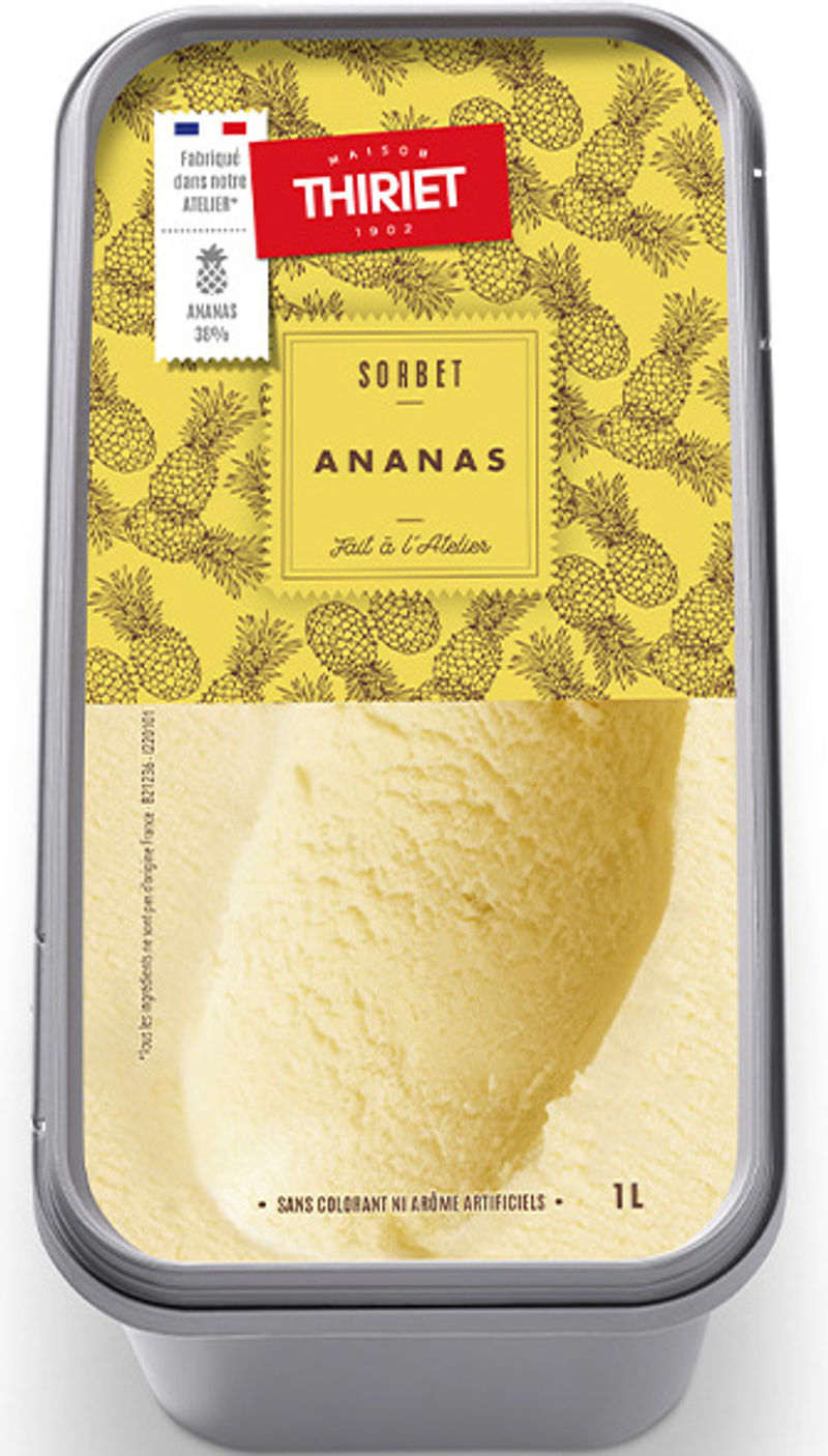 Enjoy a tropical delight right from your freezer with Maison Thiriet's Pineapple Sorbet! Made with 38% pineapple juice concentrate, this refreshing frozen treat is bursting with the natural sweetness and tanginess of ripe pineapples. Its smooth, velvety texture is achieved using a blend of natural thickeners, including xanthan gum, locust bean gum, and guar gum. Accented with a hint of lemon juice and colored with natural carotenoids, our Pineapple Sorbet promises a vibrant, fresh, and fruity experience in each scoop.