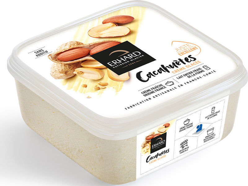 Indulge in the luxurious taste of Erhard's Peanut Ice Cream, a gourmet treat straight from France. This ice cream is a rich and creamy delight, crafted from pasteurized whole milk sourced directly from the farm which accounts for 54% of its composition. The irresistible flavor combination features a mouthwatering blend of 11% roasted CACAHUETA paste and 8.2% salted roasted CACAHUETA, creating an unforgettable peanutty delight. To add to its appeal, this decadent dessert contains fresh pasteurized cream and egg yolk from free-range hens, making it an indulgent choice for any sweet tooth.