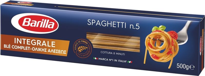 Discover Barilla’s Wholegrain Spaghetti, a healthy and tasty choice for your pasta meals. Made with complete semolina of hard wheat and water, this spaghetti is full of fiber, providing you with a meal that is as nutritious as it is delicious. This product may contain traces of soybeans, adding an extra hint of flavor. Ideal for those who prefer a healthier alternative, choose Barilla's Wholegrain Spaghetti for a delightful balance of wholesome goodness and authentic Italian taste.