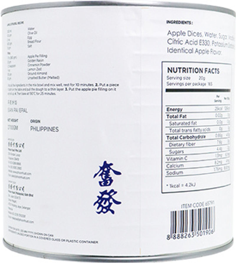 The APPLE PIE FILLING DICES 2.7KG is a delicious, easy-to-use dessert essential for all your baking needs. This premier product comes packed with diced apples, sweetened and preserved for the perfect pie filling. The natural identical apple flavor gives it an authentic homemade taste, while the added citric acid offers a slightly tangy twist. This ready-made filling is not only convenient but also versatile, allowing you to explore various dessert options.