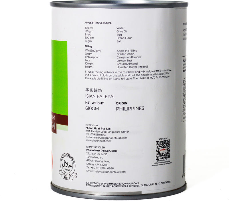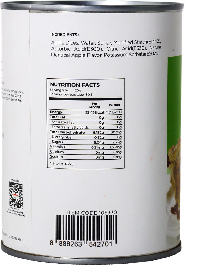 Indulge in the sweet, nostalgic taste of a classic dessert with our APPLE PIE FILLING DICES 610G. This ready-to-use filling is packed with delicious, juicy apple dices, pre-cooked in a savory blend for your convenience. It is made to offer you the authentic, homemade pie experience without the fuss of peeling and dicing apples. Perfect for any time of the year, but particularly comforting during the colder months!