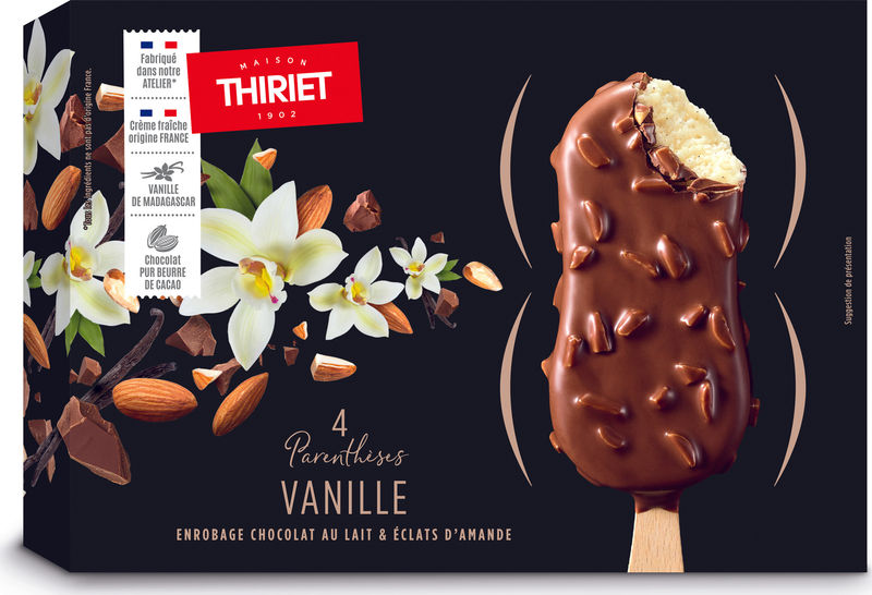 Indulge in the luxurious Maison Thiriet 4 Milk Chocolate and Almond Coated Vanilla Ice Cream, an exquisite blend of smooth and creamy vanilla ice cream, coated with luscious milk chocolate and topped generously with crunchy almond slivers. Crafted from premium ingredients including French rehydrated skimmed milk powder, fresh cream, and Madagascar vanilla, each scoop promises a burst of flavours and a delightful crunchiness that is guaranteed to excite your palate. This frozen treat is not just a dessert, it's an experience that brings France's finest to your table, making every meal special.