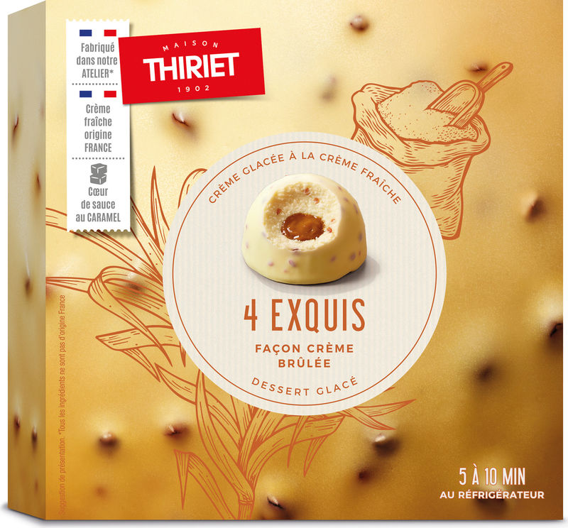 Feast your senses on the delicate flavor of Maison Thiriet's 4 Exquis Crème Brûlée. This quintessentially French dessert is a sublime blend of creamy rehydrated skimmed milk powder, authentic French sour cream and a hint of white chocolate. Infused with natural vanilla flavor and topped with a layer of caramelized sugar, this delectable treat is adorned with caramel chips and a hint of honey for an unforgettable flavor experience. Encased in an easy-to-serve portion, this frozen dessert brings a touch of French gastronomy to your table, making it an ideal choice for festive celebrations or indulgent moments of sweet craving.