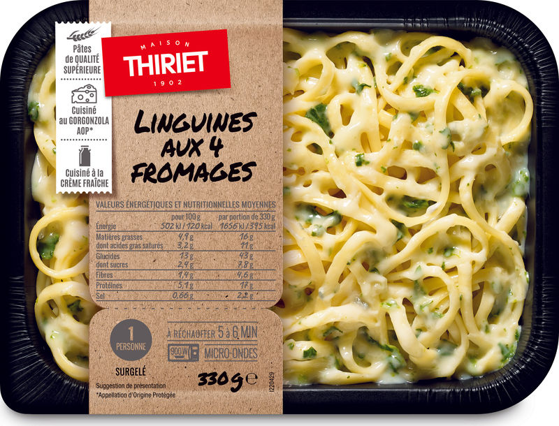 Maison Thiriet's 4 Cheeses Linguine is easy to prepare from frozen, simply heat it in the microwave or on the stovetop as per the instructions on the packaging. It can be served as a main course for lunch or dinner. For a truly gourmet experience, pair it with a glass of white wine and a fresh green salad.