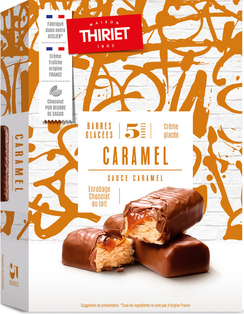 Indulge in the rich, velvety sweetness of Maison Thiriet's 5 Caramel Ice Cream Bars. Each bar is a luxurious blend of rehydrated skimmed milk powder, creamy milk chocolate, and authentic French sour cream. The lavish layer of sour cream caramel, laced with Guérande salt, known for its Protected Geographical Indication, further enhances the indulgence. Dipped in an enticing shell of milk chocolate, these bars are a testament to Maison Thiriet's mastery of the art of ice cream making. Crafted with meticulous care, these frozen delights bring a taste of French gourmet to your palate.