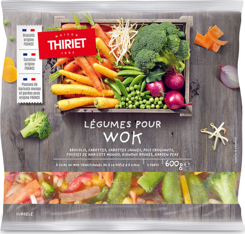 Experience the vibrancy and freshness of Maison Thiriet's Vegetable Mix for Wok. A colorful blend of French-grown broccoli, carrots, yellow carrots, mung bean sprouts, and red onions, together with crisp peas from Belgium, Luxembourg, and the Netherlands - this frozen vegetable mix promises a quick and nutritious addition to any meal. With the perfect blend of 70% French origin vegetables, this mix not only supports local farmers, but also ensures that you enjoy a high-quality, flavor-packed meal, even on the busiest of days.