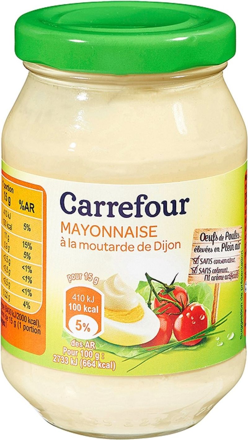 Experience the blend of rich flavors with Carrefour's Mayonnaise with Dijon Mustard. Crafted from quality ingredients such as rapeseed oil, egg yolk from hens raised outdoors, Dijon mustard, and a hint of apple extract, this mayonnaise promises to deliver a refreshingly tangy twist to your meals. The product also features white wine vinegar, salt, alcohol vinegar, modified corn starch, sugar, mustard extract, natural mustard flavor, and concentrated lemon juice, all blended perfectly to create a condiment that adds a gourmet touch to any dish.