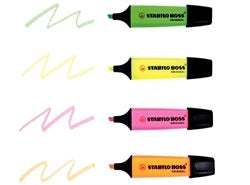Illuminate your notes with our pack of 4 Stabilo Boss Highlighters, available in a vibrant assortment of colours - green, yellow, pink, and orange. These standard highlighters will add a splash of colour to your important documents and study notes, helping you organise your information and remember key points with ease. Each highlighter boasts a long-lasting ink supply, ensuring durability and longevity in every stroke. The fast-drying nature of the ink means no smudging or mess, making them perfect for both right and left-handed individuals.