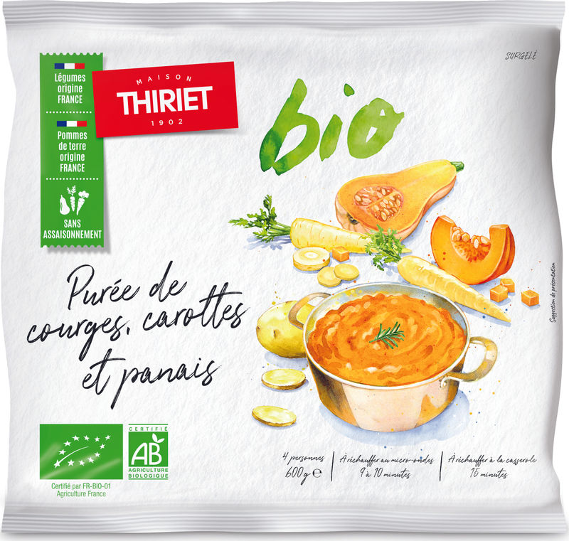 Maison Thiriet's Organic Squash, Carrot and Parsnip Purée is not just tasty, but also very flexible and effortless to prepare. Simply heat the frozen purée in a saucepan over medium heat, stirring occasionally until it reaches your desired consistency. You can also microwave it for a quicker meal. This purée can be served as a side dish, or used as a base for soups, sauces, and even baby food.