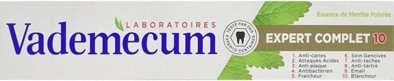 Introducing Vademecum's Complete Expert 10 Toothpaste, peppermint. This dental wonder is all you need for complete oral care. With a formula enriched with hydrated silica, glycerin, sodium fluoride, and other active ingredients, it helps to fight against tooth decay, plaque buildup, and gum disease. Enjoy the refreshing peppermint flavor that leaves your breath feeling fresh and clean. Along with the great taste, our toothpaste also helps to brighten your teeth and gives them a sparkling whiteness. It's your one-stop solution to maintaining good dental hygiene, promoting tooth strength, and ensuring a dazzling white smile.