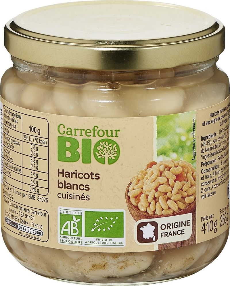 Indulge in the wholesome goodness of Carrefour's Organic White Beans. These nutritious beans are carefully selected and soaked to perfection, then complemented with a mélange of organic ingredients like carrots, onions, aromatic garlic, thyme, and bay leaf, lending a rich flavor profile that's as hearty as it is healthy. The careful addition of noirmoutier salt further enhances the taste, making these beans a must-have in your pantry. As a product of organic farming, these beans not only deliver on taste but also ensure you're making a conscious choice for the environment.