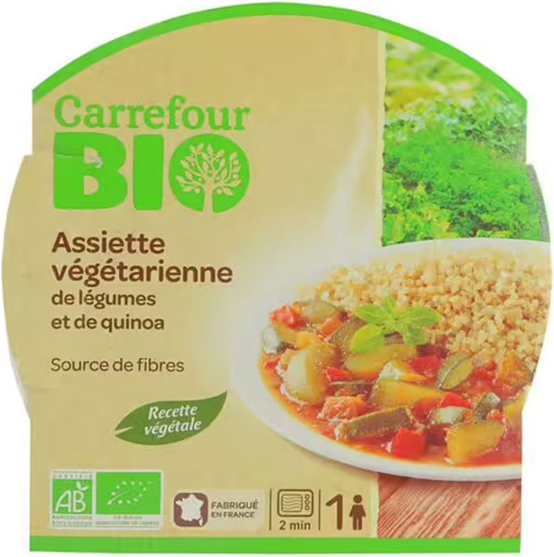 Savor the rich flavors of our Organic Vegetarian Plate With Vegetables And Quinoa brought to you by Carrefour. This delicious, ready-to-eat dish is packed with 46% organically grown vegetables and 37% perfectly cooked quinoa, which provides a substantial source of protein and fiber. It features an appetizing mix of courgettes, onions, aubergines, crushed tomatoes, and a hint of red and green peppers, all seasoned with aromatic herbs like thyme, oregano, parsley, and rosemary. It is ideal for those who love wholesome and natural meals but don't have the time to prepare them from scratch.