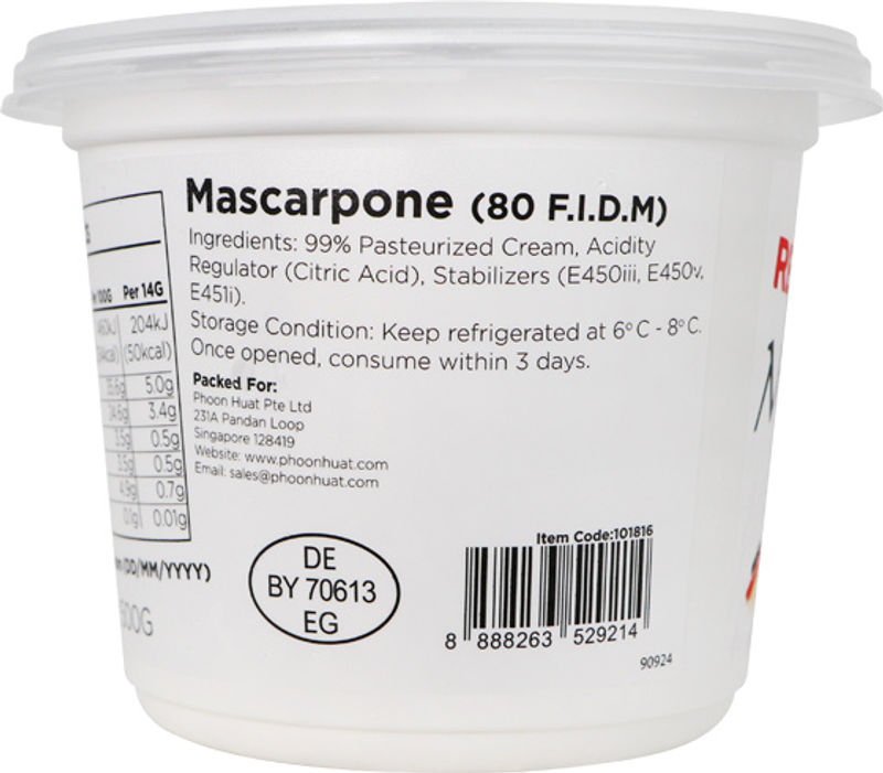 Redman's Mascarpone Cheese 500G, made in Germany, is a rich, creamy culinary delight. Exquisite in taste with a velvety texture, it is made from 99% pasteurized cream, citric acid, and stabilizers. Its high-quality ingredients make it a versatile kitchen staple, ideal for both sweet and savoury dishes, truly satisfying the discerning palate of cheese lovers.