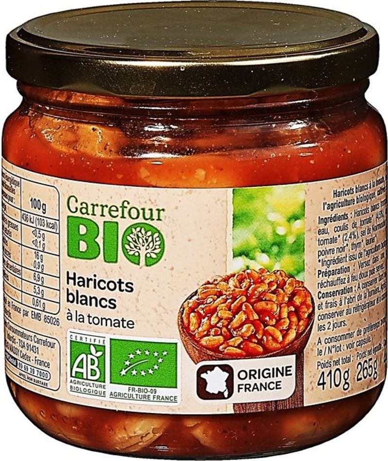 Enjoy a hearty and nutritious meal with our Organic Baked Beans by Carrefour. Made with 51.2% organic white beans, each spoonful delivers a rich burst of natural flavor, perfectly complimented by a tangy tomato coulis and concentrate mix. What sets our beans apart is the addition of Noirmoutier salt, a world-renowned French sea salt known for its delicate taste and high mineral content. A touch of garlic, black pepper, thyme, and bay leaves competes this wholesome blend, creating a delicious savory dish that's also good for you.