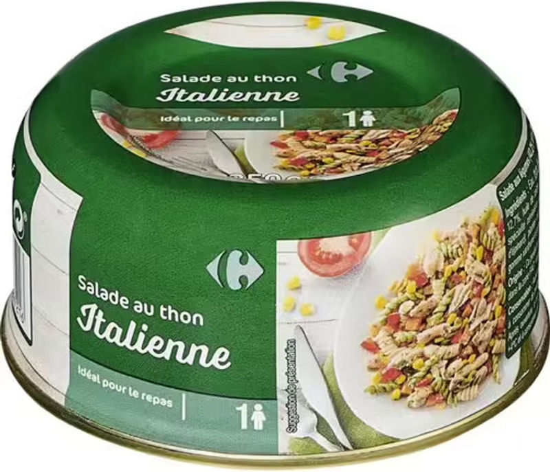 Introduce your taste buds to extravagance with Carrefour's Italian Style Tuna Salad. Prepared with pride, this ready-to-eat salad is the perfect fusion of select ingredients like LISTAO TUNA, maize, tomatoes, carrots, and a unique blend of herbs. The flavorful twist of cereal specialities, made from hard wheat semolina, powdered egg white, and spinach, adds an unexpected, delightful crunch. Perfected with a touch of white pepper and the richness of rapeseed oil, this magnificent dish is bound to leave a lasting impression on your palate.