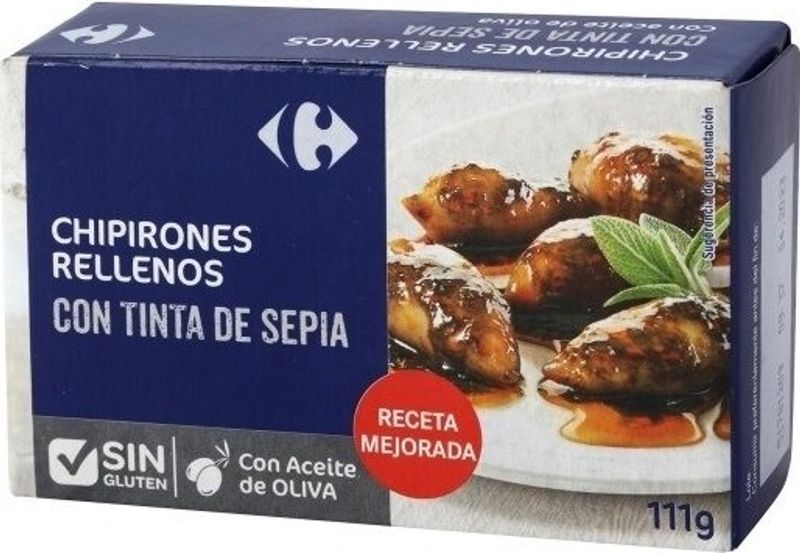 Carrefour Espana presents the authentic Chipirones rellenos con tinta de sepia, a traditional Spanish delicacy of squids stuffed with cuttlefish ink. This exquisitely savoury treat is prepared using fresh squids, filled with a rich blend of reconstituted tomato concentrate and aromatic olive oil, then subtly flavoured with onion, salt, and paprika extract. The addition of cuttlefish ink not only lends a deep, black hue but also imparts a unique, savoury taste to the stuffing. This tantalizing antipasti comes ready to heat and serve, making it a convenient, gourmet addition to your meals.