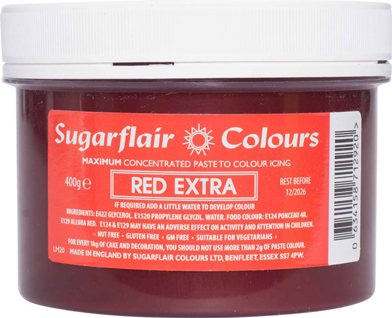 Dive into the world of colorful baking with MAX CONCENTRATED COLOR PASTE-RED EXTRA C201 400G. Manufactured by the trusted international brand, SUGARFLAIR, this vibrant color paste is made with top-notch quality ingredients. SUGARFLAIR prides itself in contributing significantly to the growth of sugarcraft in the UK since the 1980s. This bold, red color paste is not just vibrant, but also highly concentrated, ensuring a little goes a long way. Add a dash of this British-made product to your baking and watch as it transforms your creations into bold, eye-catching masterpieces.