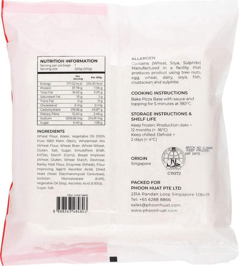 Our SQUARE WHOLEMEAL PIZZA BASE 8" PAR-BAKED 5PC is a wholesome and delicious foundation for any pizza creation. Crafted with a blend of wheat flour, wholemeal, and vegetable oil, this nutritious and hearty base is perfect for health-conscious pizza lovers. Our Halal-certified product, originating from Singapore, is par-baked to perfection, saving you time without compromising on taste.