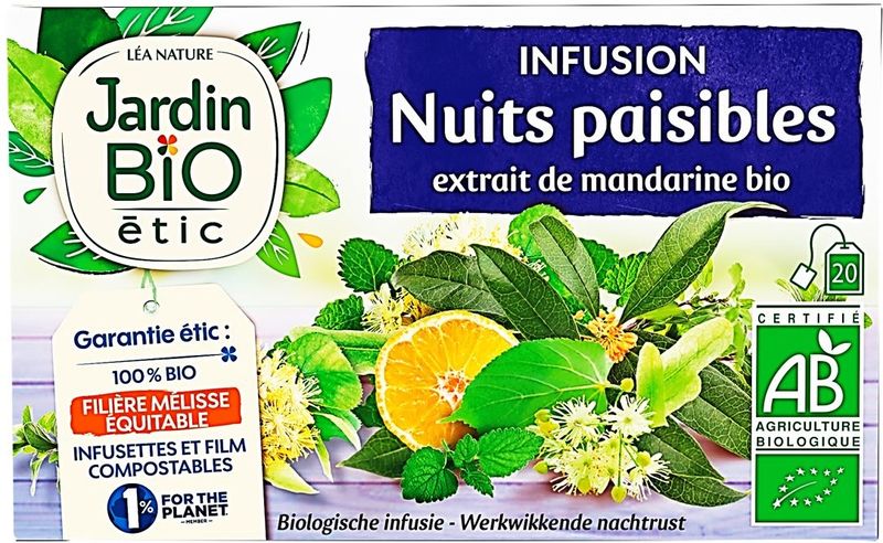 Savor the tranquil blend of botanicals in the Organic Herbal Tea Sweet Nights by Jardin Bio. This delightful infusion combines the calming properties of linden and lemon balm with the subtle citrus notes of sour orange leaf, orange, and mandarin extracts. All ingredients are sourced from organic farms, ensuring a pure and natural taste in every cup. As part of Jardin Bio's commitment to sustainable practices, 32% of the total ingredients are of Fair Trade origin, contributing to a healthier planet and more equitable global trade. Perfect for a calm evening wind-down or a soothing sweet treat, this tea is a testament to the wholesome goodness of nature.