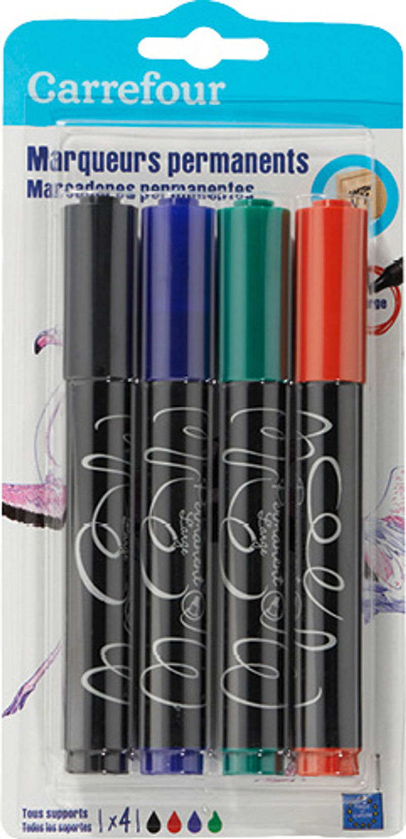 Introducing Carrefour's Pack of 4 Permanent Markers in assorted colours. These versatile and rich coloured markers are perfect for all your creative endeavours. Their large tips make for easy handling and ensure smooth and bold lines, perfect for accentuating your artwork or labelling your belongings. Suitable for use on every medium, from paper to plastic to glass, these markers are a must-have staple in your stationery drawer.