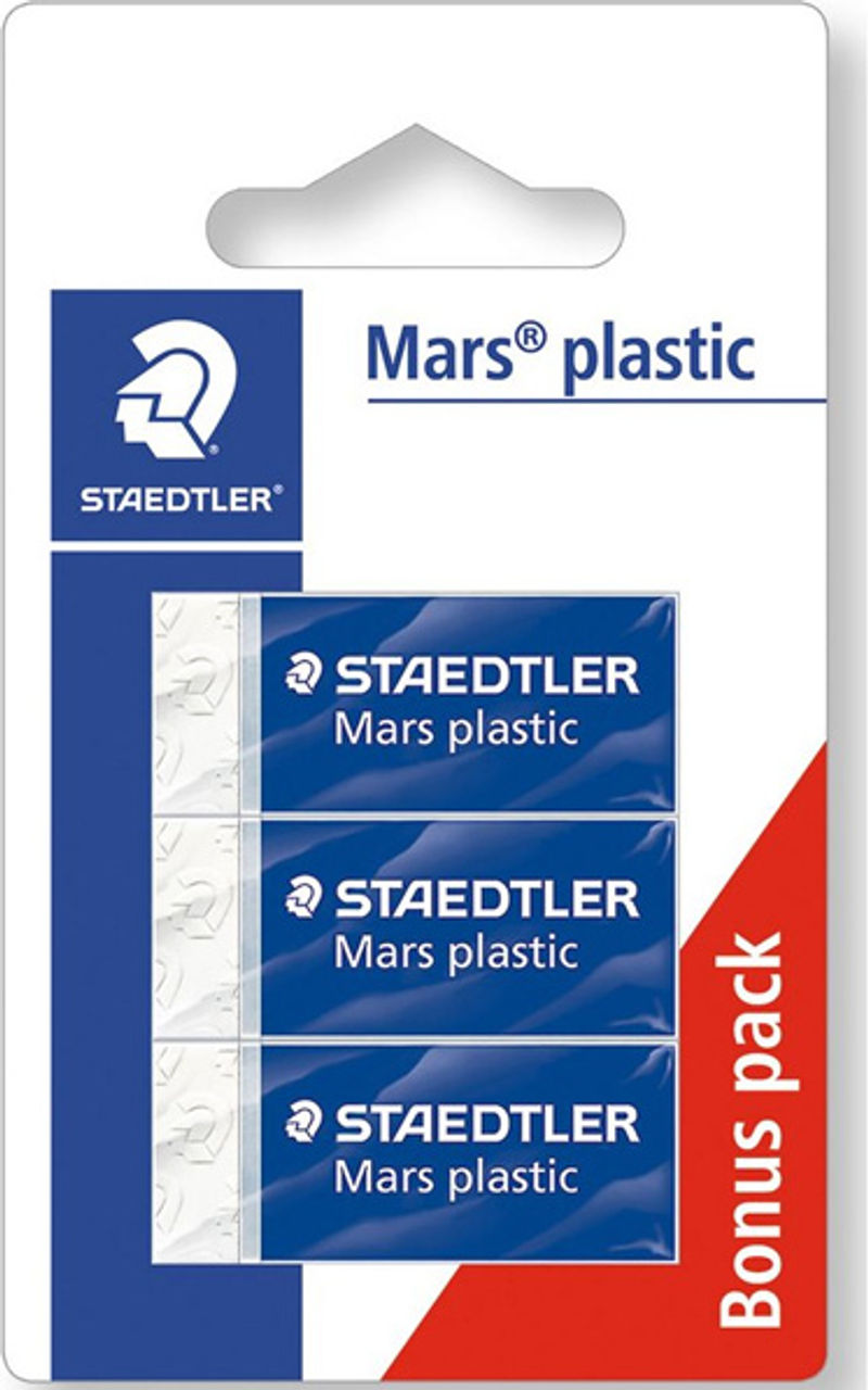 Experience superior erasing performance with the 3 White Mini Erasers Mars Plastic by Staedtler. Made in Germany, these erasers provide the best erasing results on light lines without discolouring your paper. They are phthalate and latex-free, ensuring safe usage for all users. What's more, their low residue quality ensures a clean working environment, leaving your workspace or notebook free from eraser debris. Each eraser is individually wrapped in protective cellophane packaging with a primer for easy opening, ensuring a long shelf life.