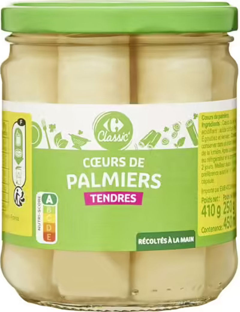Experience the exquisite taste of Carrefour Whole Tenders Palm Hearts. This high-quality product is a delicate and nutritious addition to your pantry. Harvested from the core of certain palm tree species, palm hearts are well-known for their versatility and unique, slightly tangy flavor. These tins are hygienically packed with hearts of palm, water, salt and a hint of citric acid, ensuring that the product maintains its freshness and nutritional value.