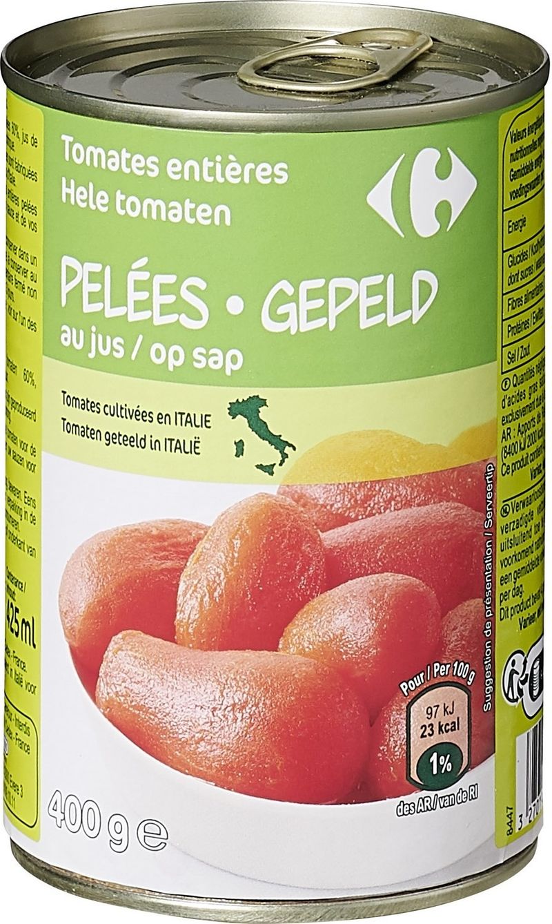 Experience the rich, robust flavor of Carrefour's Whole Peeled Tomatoes. Handpicked at the peak of ripeness, these tomatoes are carefully peeled to preserve their natural sweetness and vibrant taste. Immersed in fresh tomato juice with a dash of citric acid to retain their freshness, these whole peeled tomatoes are an excellent source of vitamins and antioxidants, promising not only a delightful gastronomic experience but also a boost to your health. Ideal for an array of dishes, they make a versatile addition to your pantry.