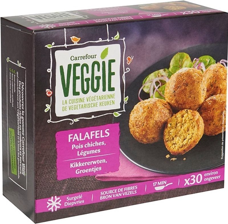 Bring a taste of the Middle East to your home with Carrefour's Veggie Chickpea Falafels. These frozen falafels are a perfect mix of rehydrated chickpeas, crunchy carrots, and zesty courgettes, all bound together with wheat flour and a medley of aromatic spices. The hero ingredient, chickpeas, provide a rich source of proteins while the added vegetables contribute to your daily fiber intake. These crunchy, bite-sized treats are not only nutritious but also extremely flavorful, thanks to the added parsley, coriander, and natural flavours. A must-have in your freezer, these veggie falafels are ideal for those quick, yet delicious meals.