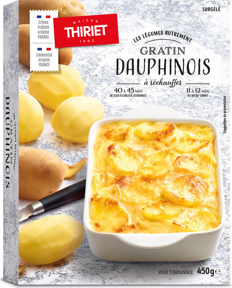 Indulge in the rich, creamy taste of Maison Thiriet's Gratin Dauphinois, a classic french dish made with the finest ingredients sourced directly from France. Each serving is filled with 47% pre-cooked potatoes, topped with a generous layer of liquid sour cream and Emmental cheese, and beautifully seasoned with garlic, a hint of nutmeg, and other natural spices. The dish is then frozen to lock in the freshness and quality, so you can savor the taste of authentic French cuisine in the comfort of your home.
