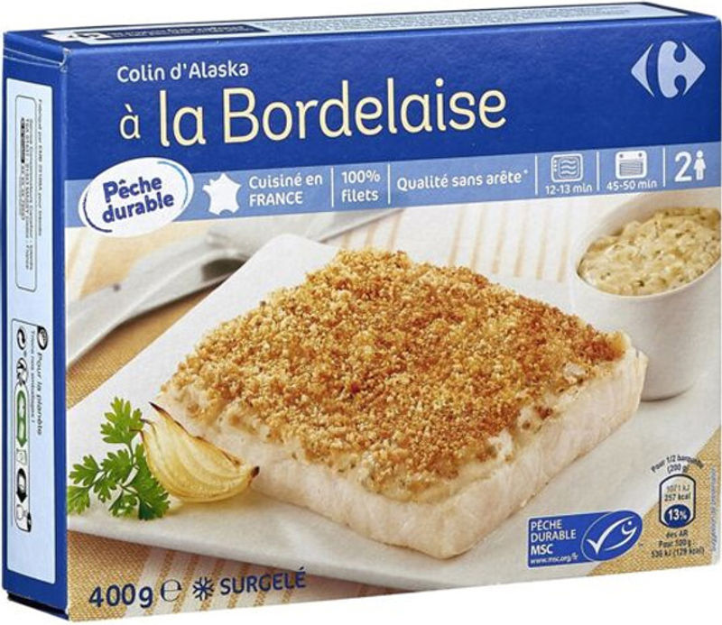 Discover the culinary excellence of France with Carrefour's Bordelaise Pollock Fillet. Sourced from the cold waters of Alaska, this premium Pollock fillet is the main star of this delicious dish, making up 55% of the ingredients. Complemented with sautéed onions, a splash of white wine, and a hint of fresh cream, this French delicacy is then garnished with lovely parsley notes and a coating of crunchy breadcrumbs. As part of Carrefour's frozen range, it guarantees a restaurant-quality dish ready in minutes, perfect for those who love delectable and convenient meals.