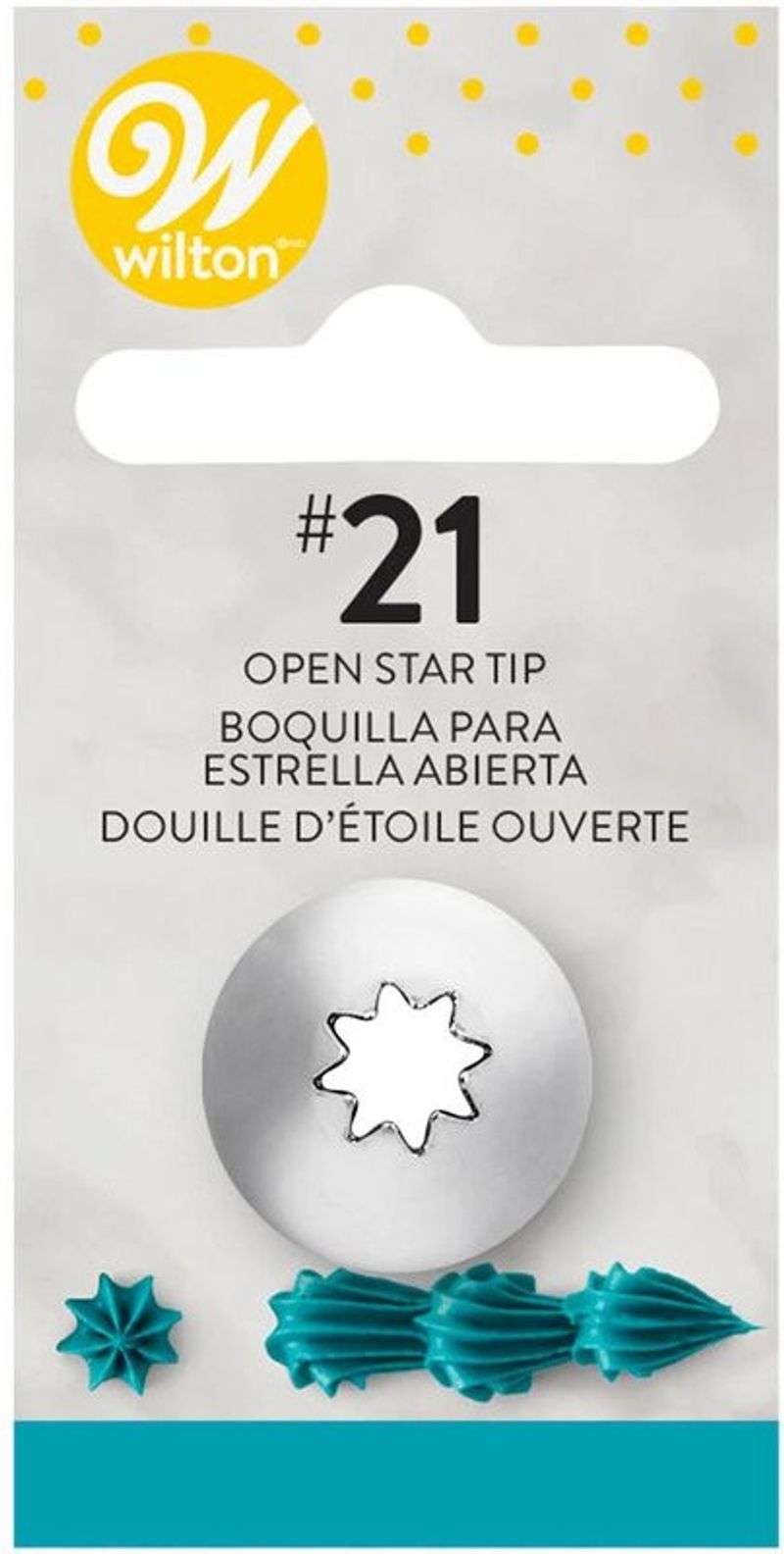 Introducing the PIPING TIP OPEN STAR #21 CARDED, a top-quality essential tool for your baking endeavors. This product is designed to let you create beautiful and professional-looking designs on your cakes, cupcakes, and other pastries. The open star design will allow you to make eye-catching and delicious details with precision. It's easy to use and clean, making it a must-have addition to your baking tools.
