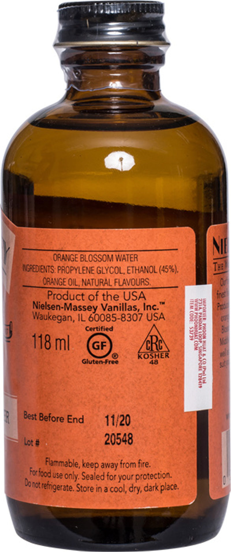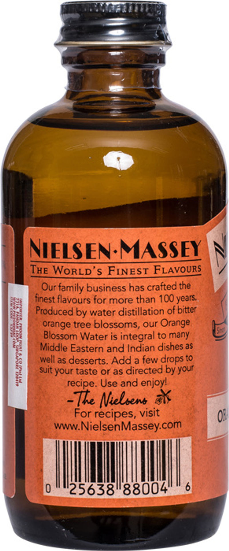 Discover the essence of natural flavors with ORANGE BLOSSOM WATER 4OZ by Nielsen-Massey Vanillas. Crafted since 1907, this exquisite flavor extract brings the world's finest vanilla products to your kitchen. Nielsen-Massey uses only the choicest beans from Madagascar, Mexico, and Tahiti to infuse this Orange Blossom Water with a distinct, vibrant character. The unique botanical extractives in this all-natural, kosher, GMO-free, gluten-free, and allergen-free product are slowly infused into an alcohol base, a process meticulously observed to ensure unmatched quality. Proudly made in the United States, this flavor extract is the perfect addition to your cooking and baking applications.