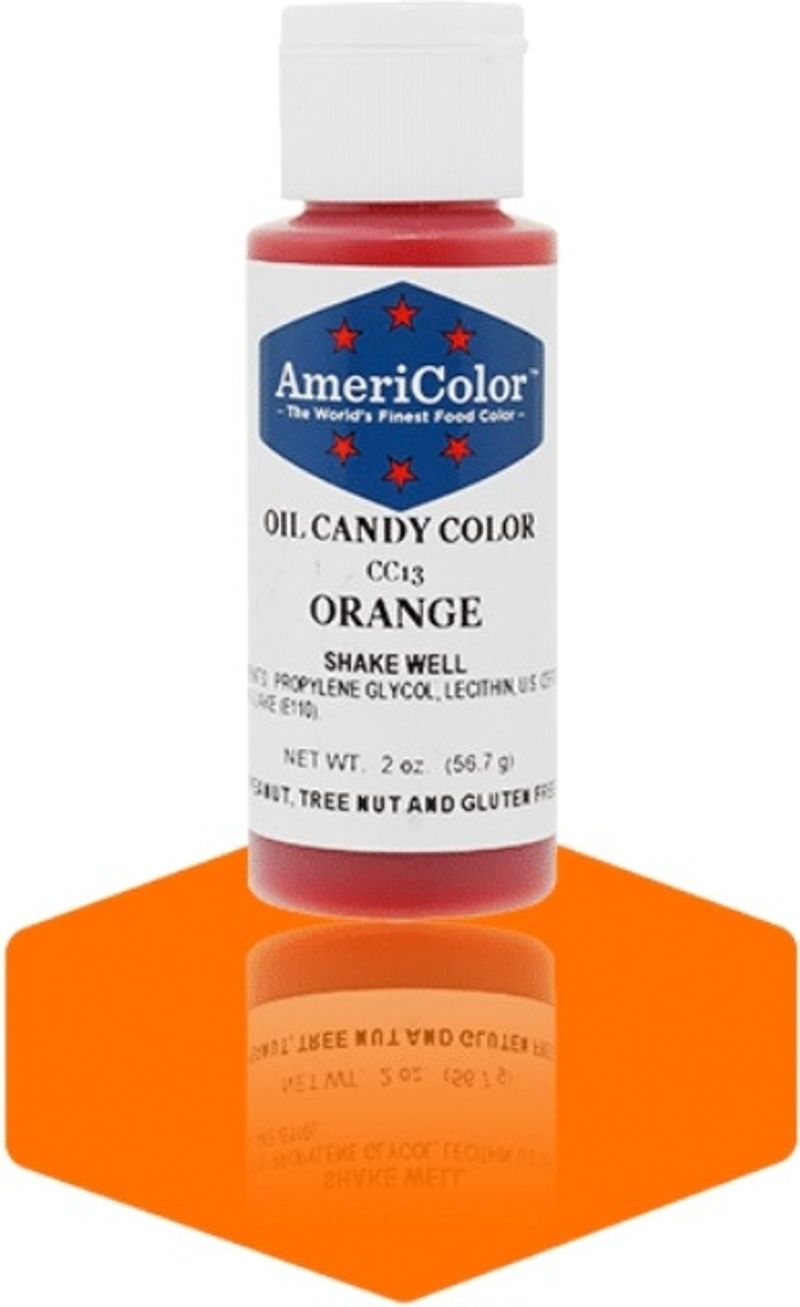 "CANDY COLOR OIL ORANGE 2OZ" is a vibrant, intensely colored oil that brings a burst of bright orange hue to your confectionery creations. This product adds a lively, playful touch to a wide variety of sweets, including hard candies, chocolates, cupcakes, and more. It's a must-have for both professional bakers and homemade candy enthusiasts.