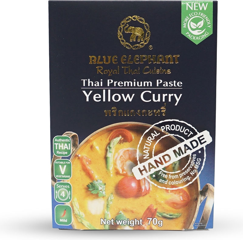Savour the authentic tastes of Thailand with Blue Elephant's Yellow Thai Curry Paste, a premium 70g blend of fresh Thai herbs and fried spices. The paste, crafted in Thailand by Master Chef Nooror, marries whole mustard, turmeric, cumin and coriander seeds to create a rich, full-bodied flavor. This versatile paste is perfect for those seeking to cook non-spicy, yet tangy and flavorful Thai curry right at home.