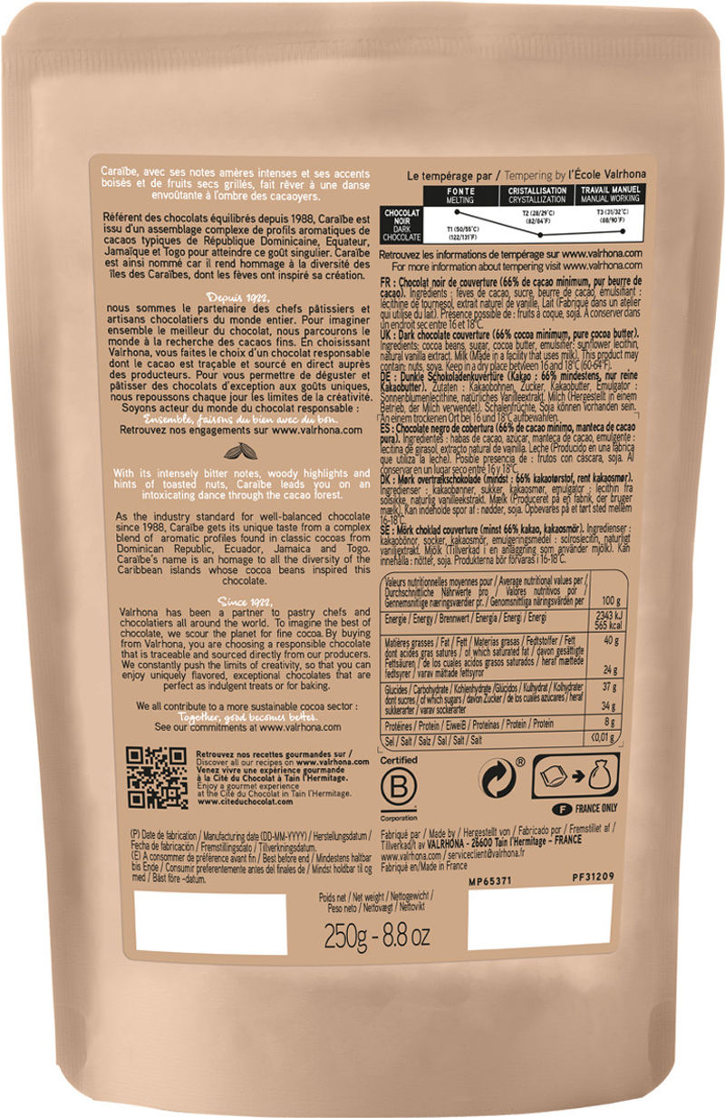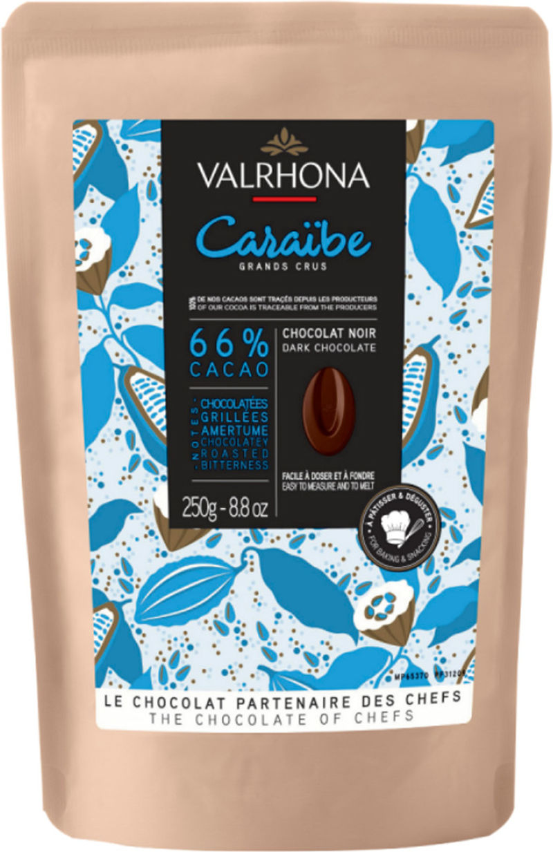 Embark on a decadent journey with the Dark Chocolate Feve Caraibe 66% by Valrhona. This high-quality, 250g product promises a luxurious experience, boasting a 66% cocoa content that delivers a rich, dark chocolate profile. Valrhona, a prestigious French chocolatier revered by connoisseurs worldwide, ensures an intense yet balanced flavor that will leave you craving for more.