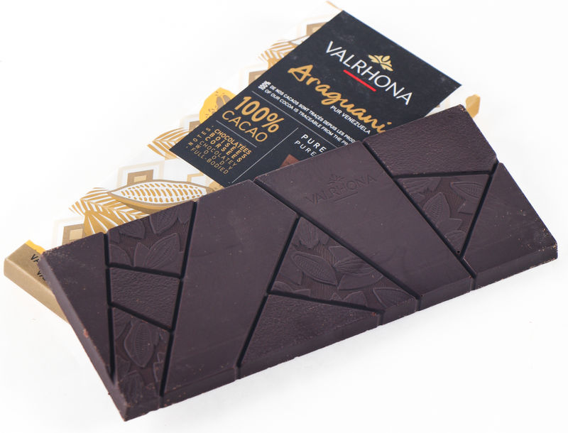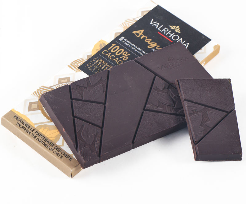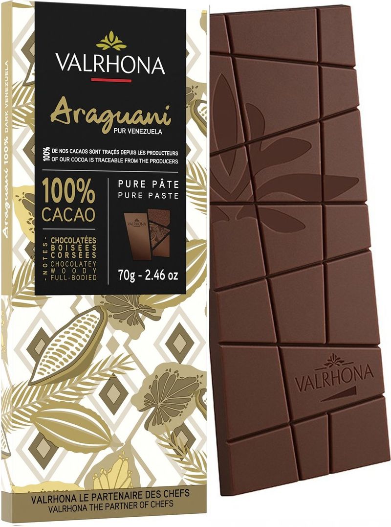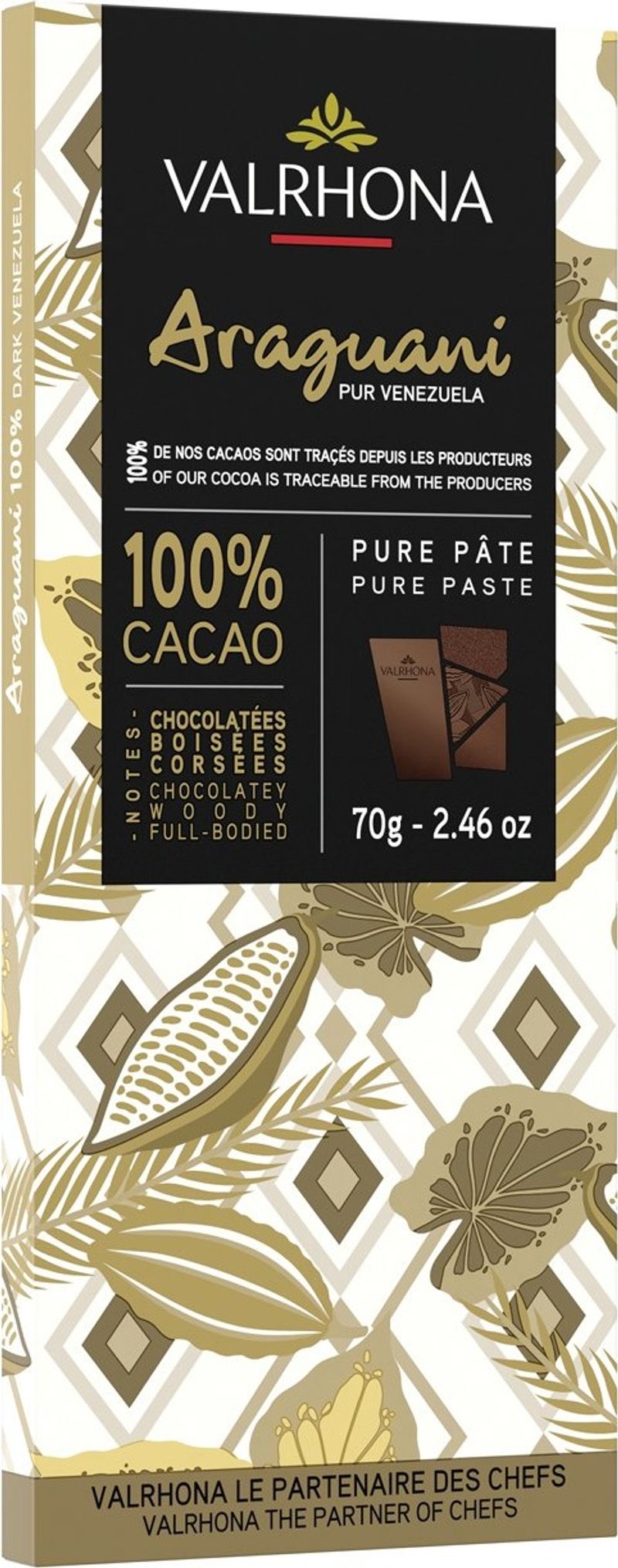 Indulge in the rich and intense flavor of Araguani Dark Chocolate 100% from the renowned brand, Valrhona. Made from pure cocoa paste, this premium chocolate bar boasts a 100% cocoa content, offering a full-bodied, robust chocolate experience like no other. Perfect for discerning chocolate connoisseurs, this high-quality chocolate is renowned for its deep bitterness and radiant cocoa flavors. Each bite takes you on a sensorial journey to the heart of the Aragua Valley in Venezuela, where the cocoa beans for this chocolate are carefully sourced and processed. Please note, this product may contain traces of nuts, milk, soya, and gluten.