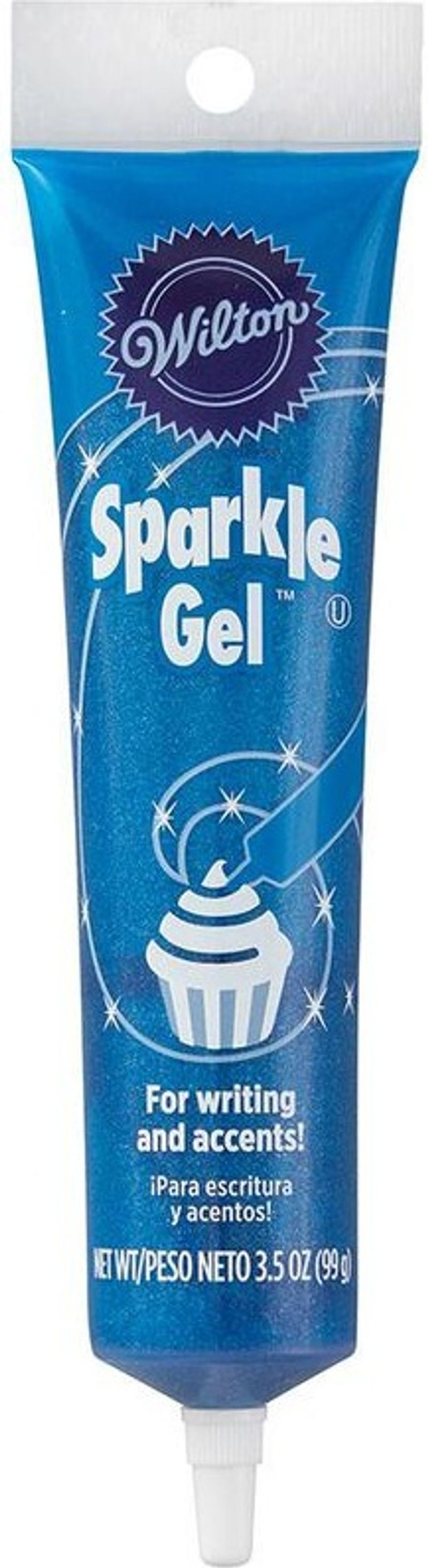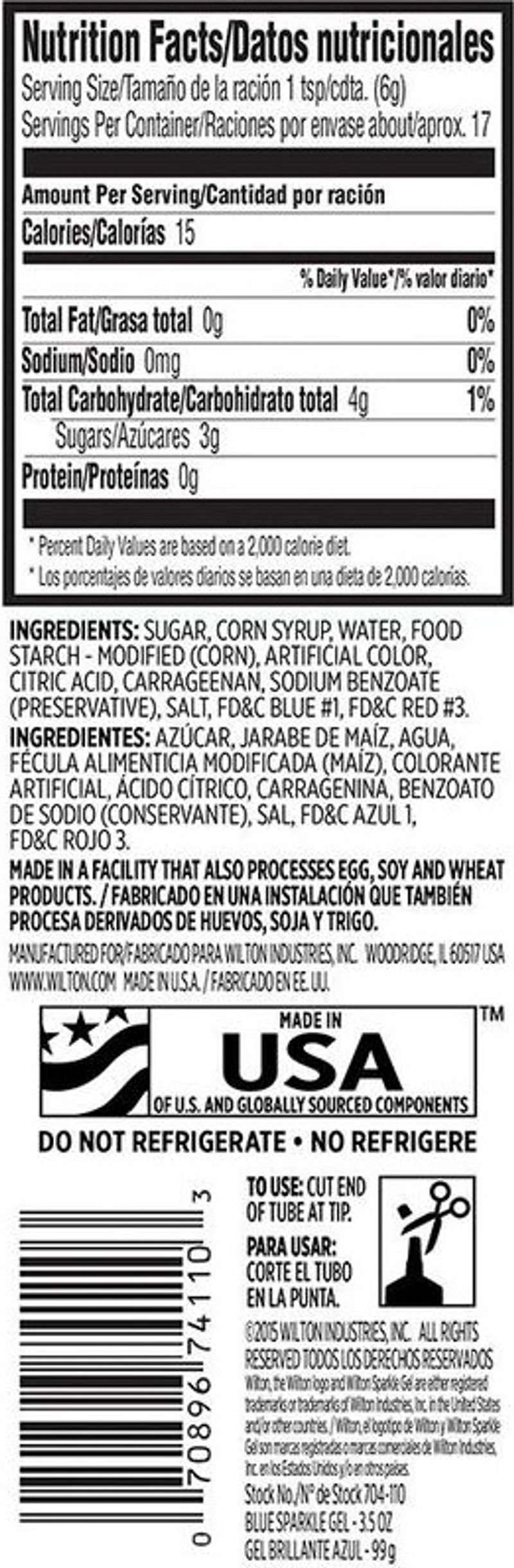The BLUE SPARKLE GEL 704-110 3.5OZ is a vibrant and exciting decorating gel that adds a touch of sparkle to any dessert. This non-drying gel is perfect for writing messages or creating cool accents on cakes, cupcakes, cookies, and other desserts. It's a kosher product, made in a facility that also processes egg, milk, soy, and tree nuts. This product contains bioengineered ingredients to ensure quality and safety.
