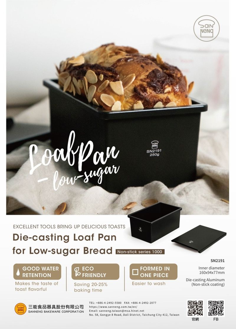 Introducing the NONSTICK LOW SUGAR LOAF PAN W LID 160X94X77 SN2191, perfect for your healthier baking needs. This loaf pan is designed specifically for low sugar recipes and features a fitted lid to ensure even and uniform baking. Made of sturdy Casting Aluminum with a non-stick P.T.F.E coating, this pan guarantees a hassle-free and enjoyable baking experience every time.