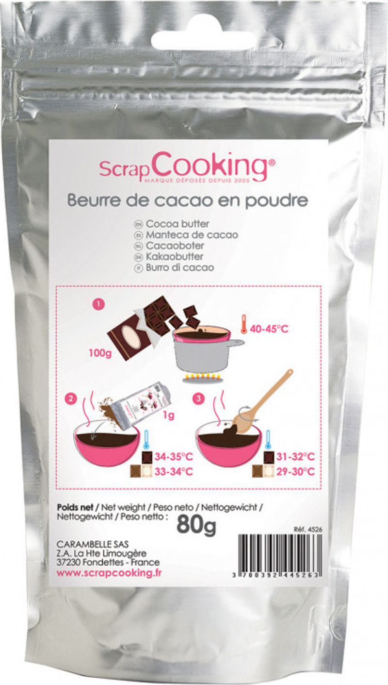 Our COCOA BUTTER POWDER 80G is 100% pure and sourced directly from France, offering you the finest quality ingredient for your baking and chocolate tempering needs. This product provides a rich, creamy texture and a heavenly aroma that enhances your culinary masterpieces. Its versatile nature allows it to be used in a myriad of applications from greasing moulds to enriching baked goods with a deliciously soft and smooth consistency.