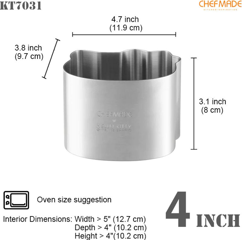 The CAKE RING 4" HELLO KITTY is a delightfully charming tool for any baking enthusiast. This 4-inch cake ring, made from high-quality stainless steel, features a fun Hello Kitty design, guaranteed to bring a smile to any dessert lover's face. Its perfect size is ideal for creating individual cakes or beautifully layered mousse-based desserts. A must-have for any themed party or casual baking day. Produced in China, this product brings a blend of durability and whimsical design.
