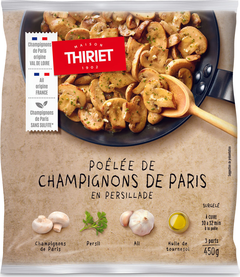 Maison Thiriet brings you a gourmet delight straight from the heart of French cuisine with our Pan-Fried Button Mushrooms in Persillade. Harvested at their peak for optimal freshness, the button mushrooms are expertly pan-fried and delicately seasoned with our special blend of parsley, garlic, salt, and black pepper, then frozen to ensure they maintain their superior taste and texture. The mushrooms make a healthy, delicious addition to your meals, providing an excellent source of vitamins and minerals.