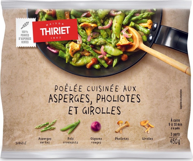 Enjoy the flavorful blend of green asparagus, crispy peas, red onions, pholiotes, and girolles with Maison Thiriet's Pan-Fried Asparagus, Pholiotes And Girolles. Each ingredient is hand-selected for top-notch quality, guaranteeing a delectable, nutrient-rich dish. This frozen vegetable assortment is not only a great source of vitamins and antioxidants but also a versatile addition to your meals. Prepared with aromatic garlic puree, parsley, and sage, and lightly seasoned with salt, it presents a perfect balance of flavors. The addition of rapeseed oil ensures a smooth, mouth-watering finish, while the thickener xanthan gum maintains its hearty consistency.