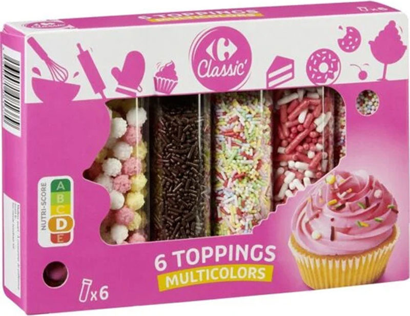 Carrefour's Edible Cake Decorations, 6 Toppings, are a delightful mix of sweet and colourful enhancements perfect for any baking creation. Featuring pink sugar candy beads, chocolate vermicelli, multicoloured sugar confectionery vermicelli, and chocolate-coated cereal balls, this selection is sure to satisfy every sweet tooth. Whether you're crafting a birthday cake, decorating cupcakes or adding a final touch to your pastries, Carrefour's edible decorations offer both taste and visual appeal. Made with all-natural ingredients, these toppings are a reliable choice for outstanding taste and quality.