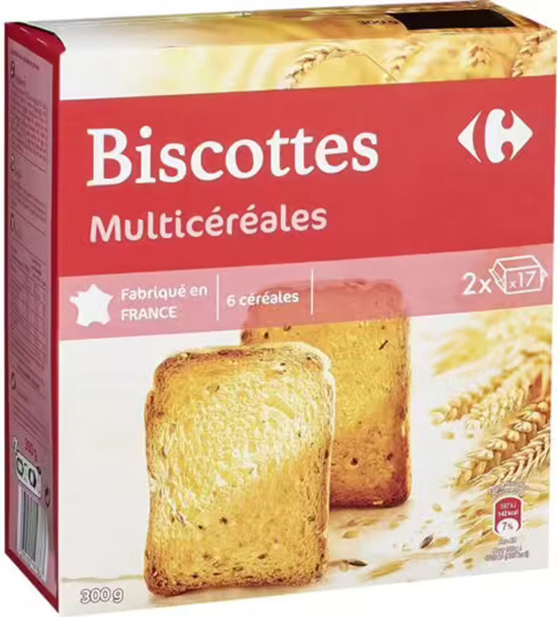 Enjoy a healthier and tastier breakfast with Carrefour's Multicereals Biscottes. These mouthwatering biscottes are made with a blend of 72% cereal flours, including wheat, barley, and rye, combined with brown linseed, yeast, maize germ, toasted sesame seeds, rapeseed oil, and oats. They're a nutritious choice to start your day, offering a wholesome mix of fiber and proteins. Enhanced with a hint of sugar for a pleasing sweetness, these biscottes are not only delicious but also packed with essential nutrients.