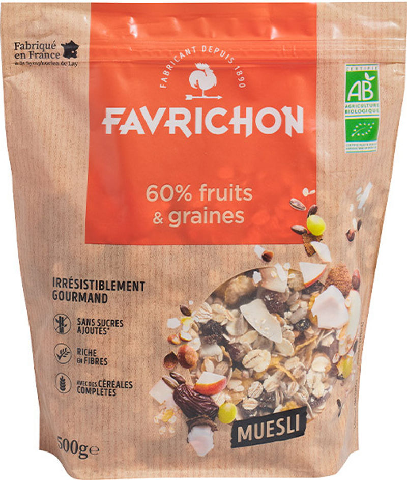 Start your day with a tasty and nutritious bowl of Favrichon's Organic 60% Fruits and Nuts Muesli. Packed with a selection of wholegrain oats, barley and corn flakes, this muesli offers a perfect blend of complex carbohydrates to keep you energized throughout the day. Filled with 42% of organic fruits including raisins, dates, coconuts, and apples, and a generous sprinkle of sunflower and pumpkin seeds, these ingredients together contribute to your daily dietary fiber intake, while offering a sweet yet subtle natural taste. The added toasted hazelnuts give it a delightful crunch enhancing the overall taste and texture of your morning meal.