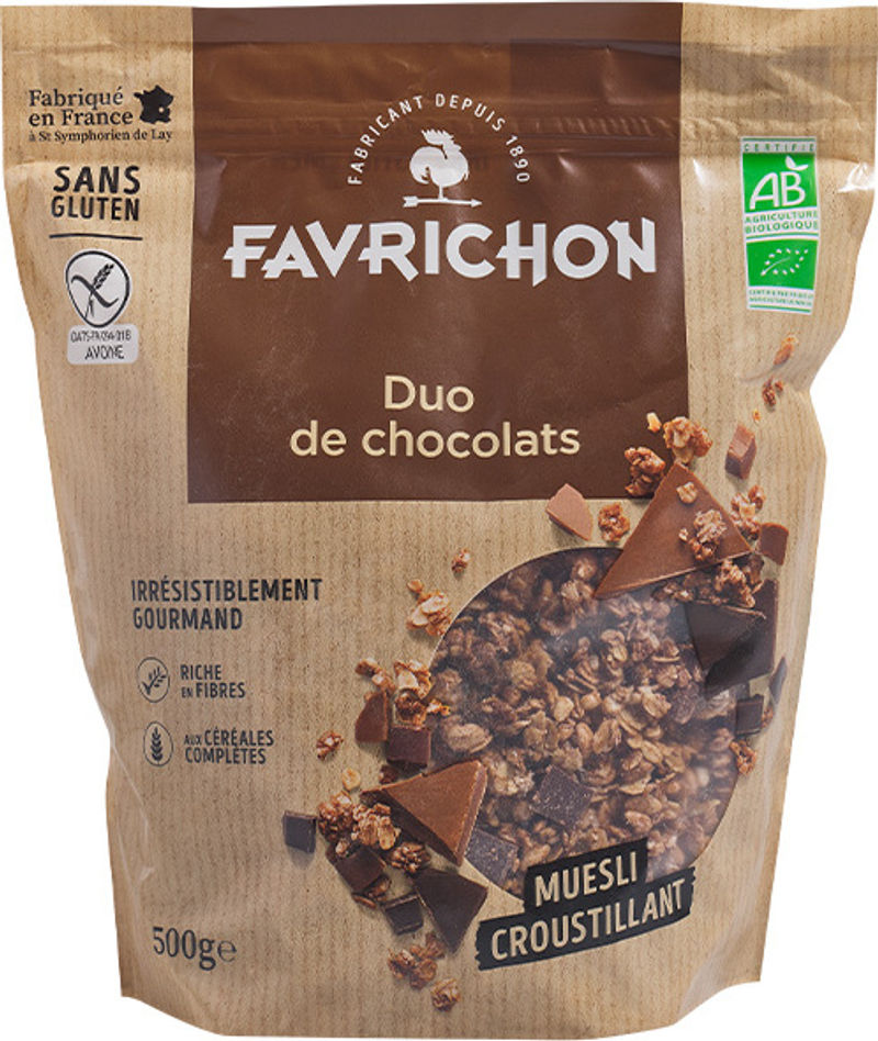 Kickstart your day with a bowl of Favrichon's Organic Chocolate Duo Muesli! This French delicacy is a delicious blend of whole grains and rich, finely chopped chocolate pieces. With 54.2% of whole grains, including oatmeal and rice, this muesli not only tantalizes your taste buds but also provides a hearty, nutrient-rich breakfast. The 15% chocolate pieces, a combination of dark and milk chocolate, offer a delightful touch of sweetness to your morning meal. This muesli is sweetened with organic cane sugar and has a hint of delectable grated coconut for an unmatched flavor. Favrichon's Organic Chocolate Duo Muesli is an excellent choice for those who like to start their day on a sweet, healthy note.