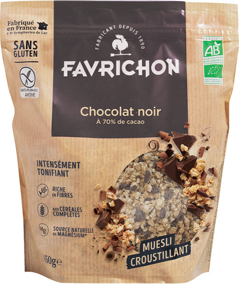 Indulge in a healthy yet delightful breakfast experience with Favrichon's Organic Crispy Muesli with Dark Chocolate 70% Cocoa. This nourishing choice is made with 64.7% whole grain cereals, including oat flakes and rice, both sourced from organic farming. Its rich, dark chocolate chips are made from 70% pure cocoa, providing a bittersweet balance to the lightly sweetened, unrefined cane sugar. Infused with sunflower oil and a hint of coconut, this muesli promises a crunchy texture and an interesting flavor profile. As a plus, it's gluten-free, perfect for those following a specific dietary regimen.
